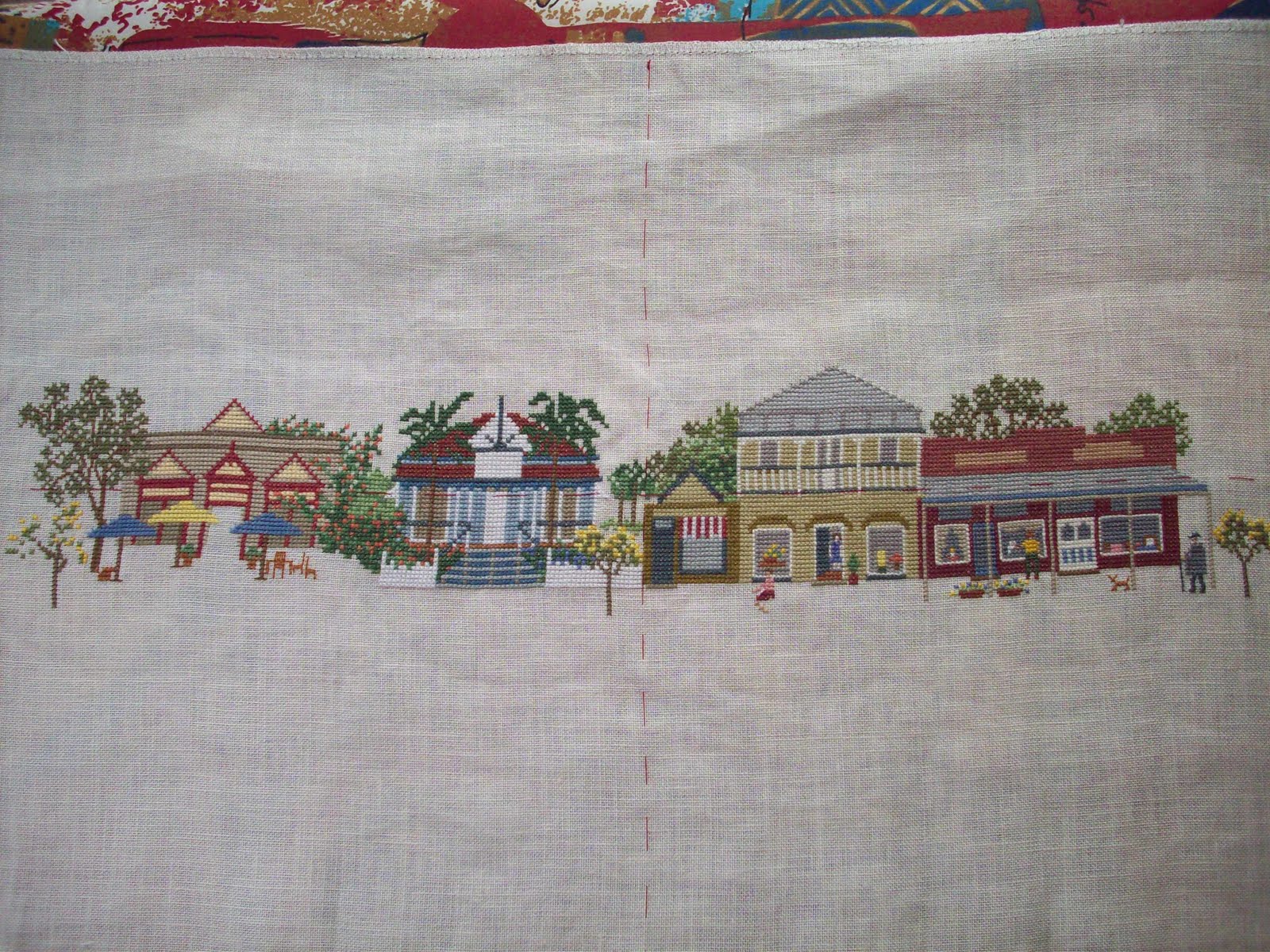 I only worked on this project about 4 times over the past fortnight and got it out for the last time this rotation after dinner last night. After I'd worked on it a couple of hours I realised that I could actually finish the cross-stitching so I stayed up to 11:45 to get this done. Luckily I'd gotten involved in a Swedish movie that went that late and that I was surprisingly able to follow even though cross-stitching meant that I wasn't able to read all the subtitles. I finished the bushes to the left of the last house (House #1) then went back and filled in the one and two stitch gaps I'd left in the palmetto tree and house. The last area I did was the inserts on the front door of the house which were DMC #415. For some reason I didn't have this colour with my threads for this project and it also wasn't in my mother's DMC box so I had to go searching in my craft cupboard for it. Luckily I found it and so was able to finish the project.